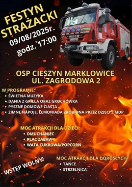 W Cieszynie Marklowicach odbędzie się festyn organizowany przez Ochotniczą Straż Pożarną, podczas którego uczestnicy będą mogli skorzystać z różnorodnych atrakcji skierowanych zarówno do dzieci, jak i dorosłych. Wydarzenie ma na celu integrację lokalnej społeczności oraz zapewnienie rozrywki w miłej atmosferze.