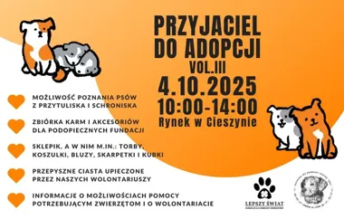 Fundacja dla Zwierząt i Środowiska „Lepszy Świat” wraz z Cieszyńskim Schroniskiem „Azyl” organizują spotkanie, podczas którego można poznać zwierzęta poszukujące nowych domów, przekazać dary i dowiedzieć się, jak wspierać lokalne schronisko. Wydarzenie ma charakter otwarty — przewidziano m.in. możliwość rozmowy z opiekunami zwierząt, zbiórkę potrzebnych rzeczy oraz sprzedaż artykułów i ciast przygotowanych przez wolontariuszy.