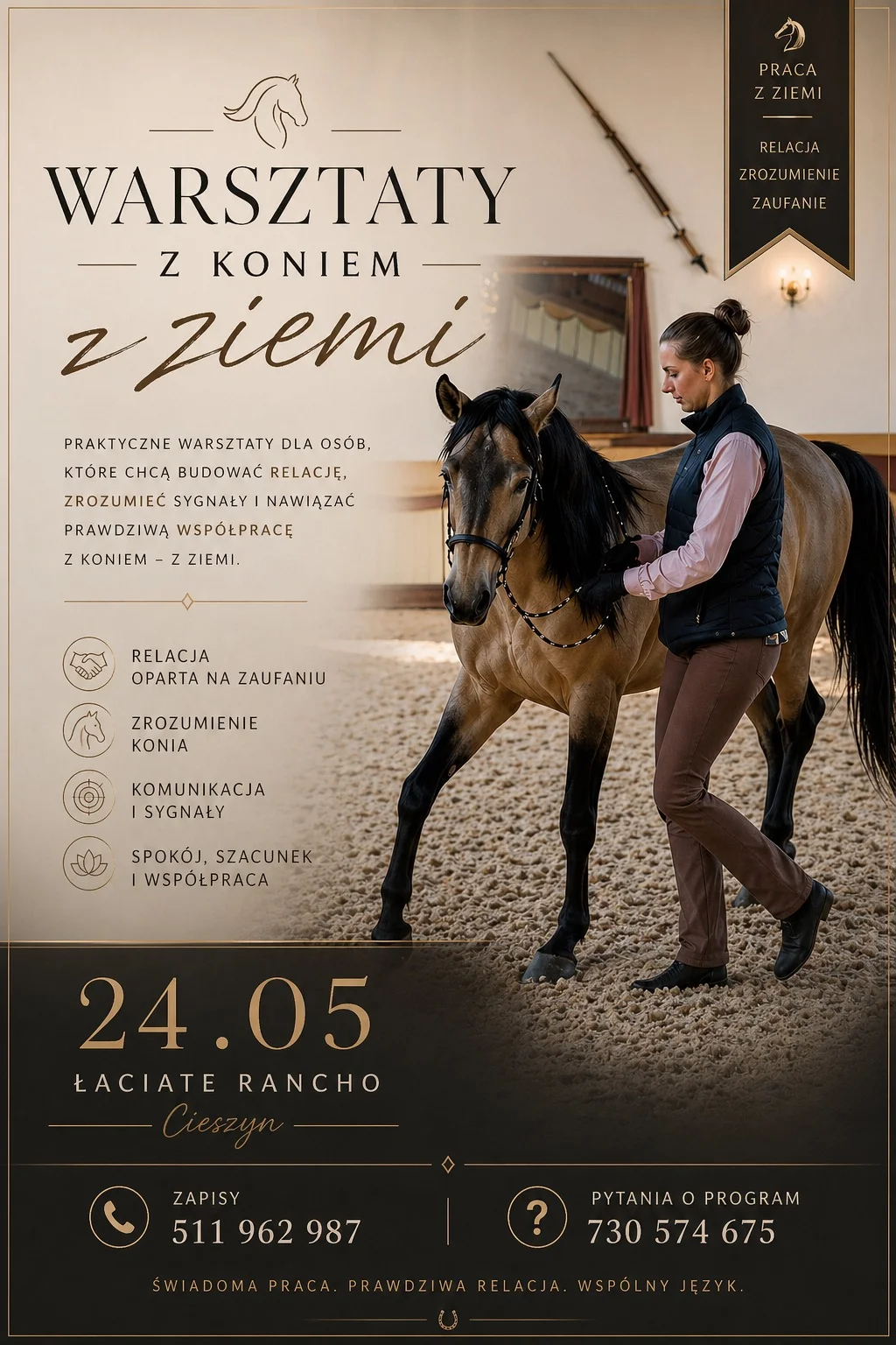 W Cieszynie zapowiada się dzień dla tych, którzy chcą lepiej zrozumieć konia i popracować nad komunikacją bez siodła To będą warsztaty z pracy z koniem z ziemi, prowadzone w praktyczny, spokojny sposób — z pokazem, ćwiczeniami i możliwością pracy zarówno na własnym koniu, jak i na koniach gospodarzy. Jeśli temat Cię kręci, warto się temu przyjrzeć bliżej.